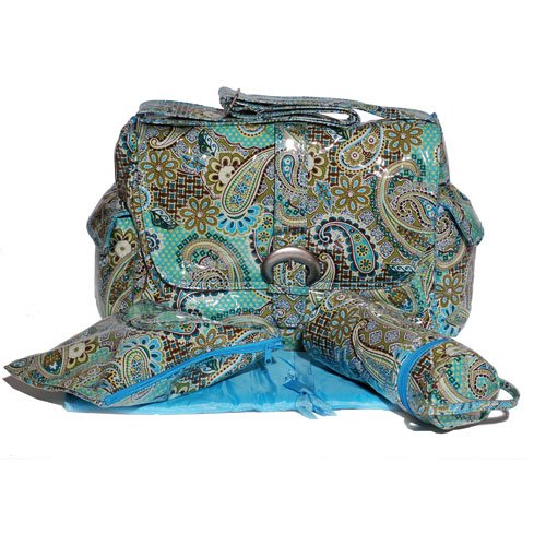 This cool little diaper bag features an pvc outer lining over corduroy fabric for easy cleaning and maintenance. The diaper bag features an oversized buckle magnetized for easy opening and closing and long adjustable over shoulder strap. The inside features multiple pockets for storage and outer pockets for bottles and cell phones. Also has a matching changing pad.